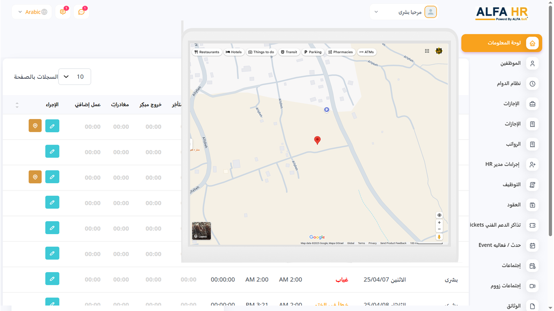 وايضا يسجل الموقع الجغرافي لمكان ختم الموظف ويظهر زر عرض الموقع في شاشة استعراض الدوام